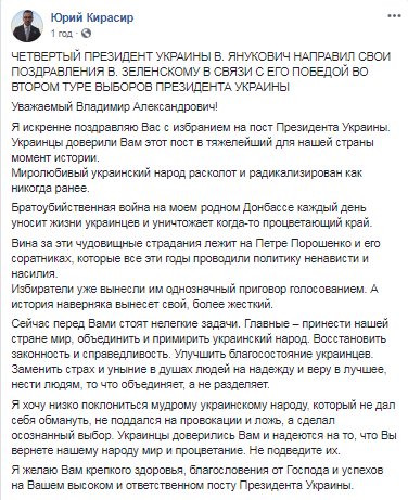 09.01 Беглый экс-президент Украины Виктор Янукович тоже поздравил Владимира Зеленского с победой. Об этом в своем Facebook сообщил представитель Януковича Юрий Кирасир.