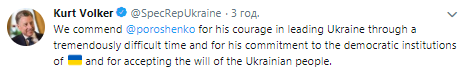 Он также поблагодарил действующего президента Петра Порошенко за "его смелость управлять Украиной в чрезвычайно трудное время и за его приверженность демократическим институтам и принятие воли украинского народа".