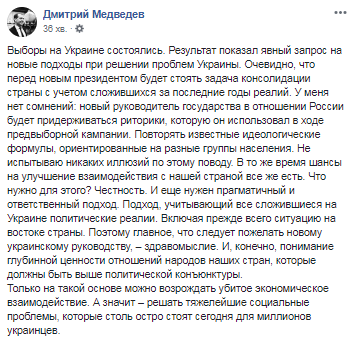 "Выборы на Украине состоялись. Результат показал явный запрос на новые подходы при решении проблем Украины. Очевидно, что перед новым президентом будет стоять задача консолидации страны с учетом сложившихся за последние годы реалий.