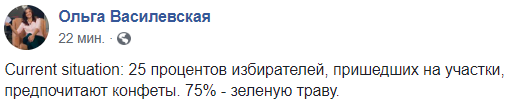 "25 процентов избирателей, пришедших на участки, предпочитают конфеты. 75% - зеленую траву".