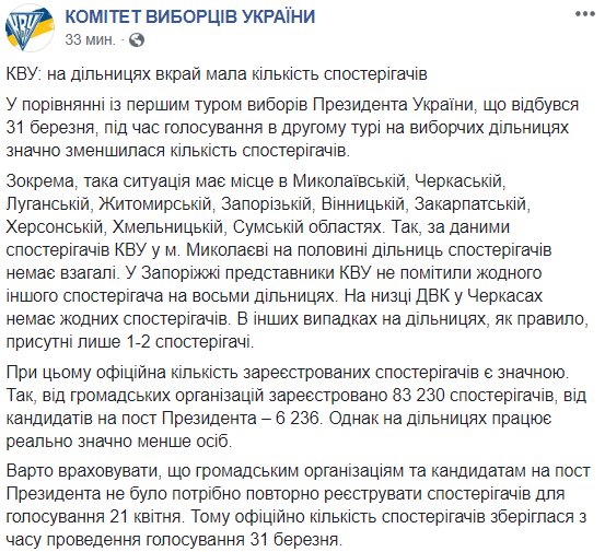 "Такая ситуация имеет место в Николаевской, Черкасской, Луганской, Житомирской, Запорожской, Винницкой, Хмельницкой, Сумской областях. По данным наблюдателей КИУ, в г.Николаеве на половине участков наблюдателей нет вообще. В Запорожье представители КИУ не заметили ни одного другого наблюдателя на восьми участках. На ряде УИК в Черкассах нет никаких наблюдателей. В прочих случаях на участках, как правило, присутствуют лишь 1-2 наблюдателя", - говорится в сообщении на странице КИУ в Facebook.