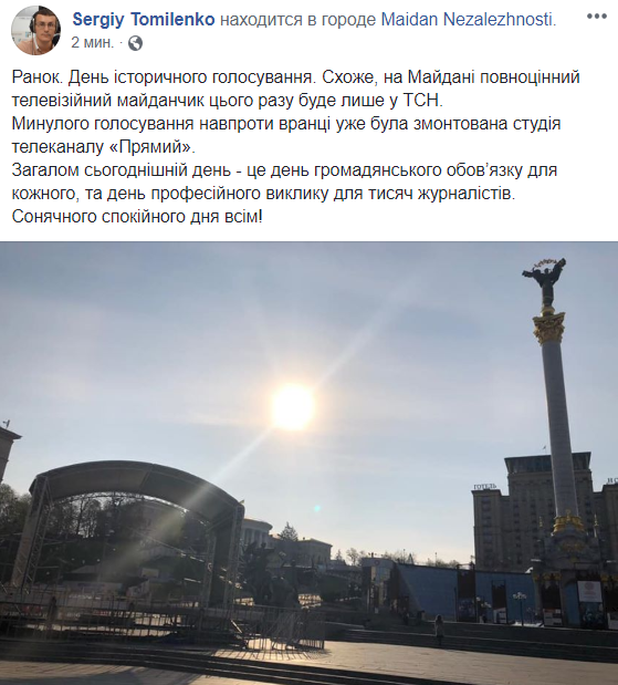 На предыдущем голосовании утром напротив уже была смонтирована студия телеканала "Прямой"", пишет Томиленко.