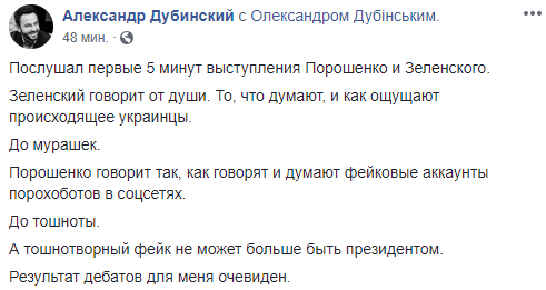 "Послушал первые 5 минут выступления Порошенко и Зеленского. Зеленский говорит от души. То, что думают, и как ощущают происходящее украинцы. До мурашек.