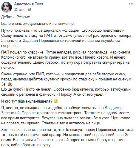 Хотя изначально ставила на то, что Зе спасует перед Порошенко, все-таки тот опытный политический оратор. Но многолетний сценический опыт Зе помог. Все шпильки Порошенко в свой адрес он смог обернуть против него, либо обратить в шутку", - написала журналист "Страны" Анастасия Товт.