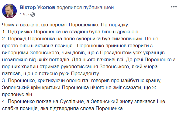 Политтехнолог Виктор Уколов считает, что в дебатах выиграл Порошенко.