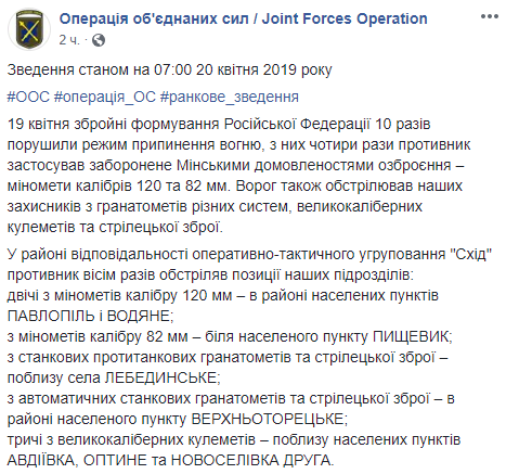 Со стороны незаконных вооруженных формирований на Донбассе 10 раз открывали огонь по позициям Объединенных сил, потерь среди военнослужащих Объединенных сил нет. Об этом сообщает пресс-центр штаба операции Объединенных сил в Facebook.