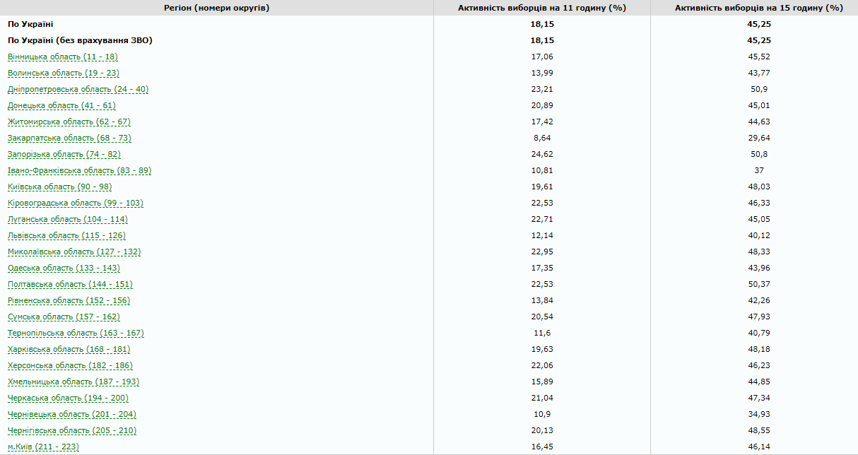 Так, по данным ЦИК с 198 округов из 199, по состоянию на 15:00 свои голоса за кандидатов в президенты уже отдали 45,27 % избирателей. Активнее всего голосуют в Днепропетровской (50,9%), Запорожской (50,8%), Полтавской областях (50,37%). Меньше всего людей проголосовало в Закарпатье - 29,64% избирателей.