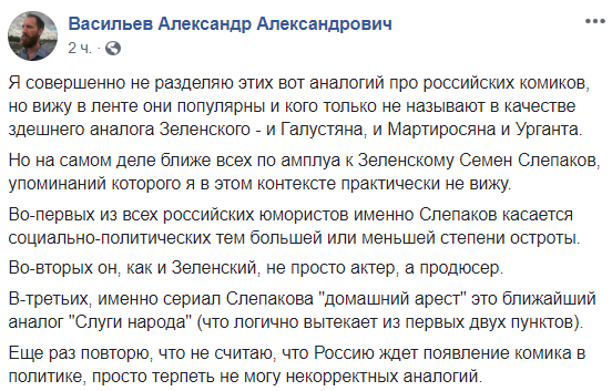 Еще раз повторю, что не считаю, что Россию ждет появление комика в политике, просто терпеть не могу некорректных аналогий", - пишет российский журналист Александр Васильев.
