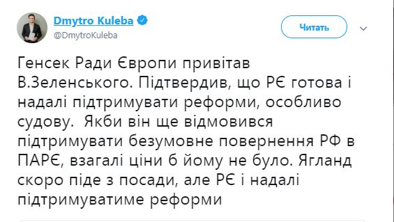 Посол Украины в Совете Европы Дмитрий Кулеба прокомментировал поздравления Ягланда. "Генсек Совета Европы поздравил Зеленского. Подтвердил, что СЕ готов и в дальнейшем поддерживать реформы, особенно судебную. Если бы он еще отказался поддерживать безусловное возвращение РФ в ПАСЕ, вообще цены бы ему не было. Ягланд скоро уйдет с должности, но СЕ и далее будет поддерживать реформы", - написал Кулеба в Twitter.