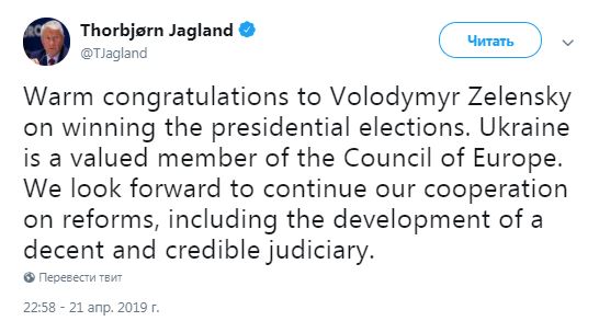 Генеральный секретарь Совета Европы Турбьерн Ягланд поздравил Владимира Зеленского с победой на президентских выборах в Украине. "Теплые поздравления Владимиру Зеленскому с победой на президентских выборах. Украина является важным членом Совета Европы. Мы надеемся на продолжение сотрудничества в сфере реформ, включая развитие достойной и надежной судебной системы", - отметил Ягланд в Twitter.