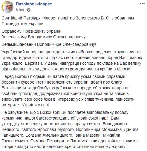Филарет опубликовал в Facebook большой пост-поздравление Зеленского