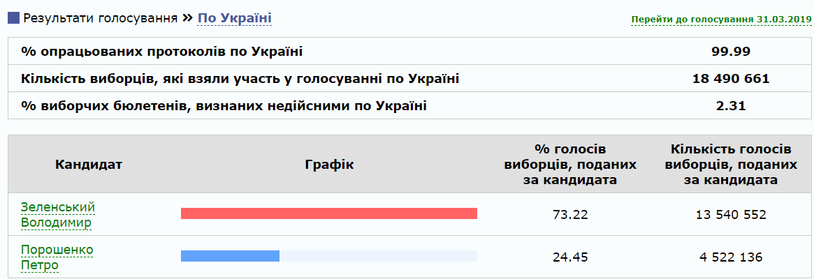 Согласно данным на сайте ЦИК, за кандидата в президенты Владимира Зеленского проголосовали 73,22% избирателей (13 млн 540 тыс. 552 человека), за действующего главу государства, кандидата в президенты Петра Порошенко - 24,45% (4 млн 522 тыс. 136 человек). Подсчитаны 18 млн 490 тыс. 661 голос избирателей. Ожидаются данные еще с 9 избирательных участков: 1 - из Винницкой области, 1 - из Луганской, 6 - из Одесской, 1 - из Херсонской.