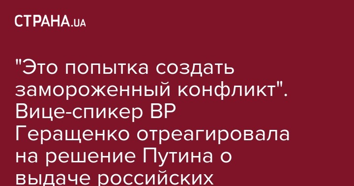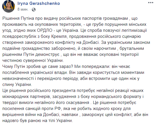 "Решение Путина о выдаче российских паспортов гражданам, проживающим на оккупированных территориях, - это грубое нарушение минских соглашений, согласно которым ОРДЛО - это Украина. Это попытка ползучей легитимизации псевдореспублик со стороны Кремля, продолжение российского сценария создания замороженного конфликта на Донбассе. По украинскому закону двойное гражданство запрещено, и своим нарочитым, грубым решением Путин демонстрирует, что он не считает оккупированные территории частью суверенной Украины", - написала Ирина Геращенко.