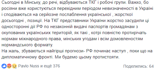 Спикер ВР также объяснила мотивы такого поступка Путина. "Мы предупреждали: он ждет ослабление украинской власти. Он всегда пользуется моментами неопределенности и переходного периода, чтобы вставить еще один нож в спину Украины. Это решение российского президента требует немедленной реакции наших международных партнеров, осуждения со стороны нормандского формата и твердого требования о немедленном отмене указа. Это решение требует усиления санкций против РФ, не делает ни одного шага для решения войны на Донбассе, наоборот, замораживает этот конфликт, чтобы он надолго был раной на теле Украины. Сегодня в Минске, кстати, происходят ТКГ и рабочие группы. Трудно, потому что россияне уже пользуются переходным периодом неопределенности в Украине и надеются на серьезное ослабление украинской, жесткой до сих пор, позиции. На ТКГ представители Украины жестко осудили эти односторонние действия РФ по незаконной выдаче паспортов гражданам из оккупированных украинских территорий, как такие, которые полностью противоречат нормам международного права, минским соглашениям и всем договоренностям нормандского формата.