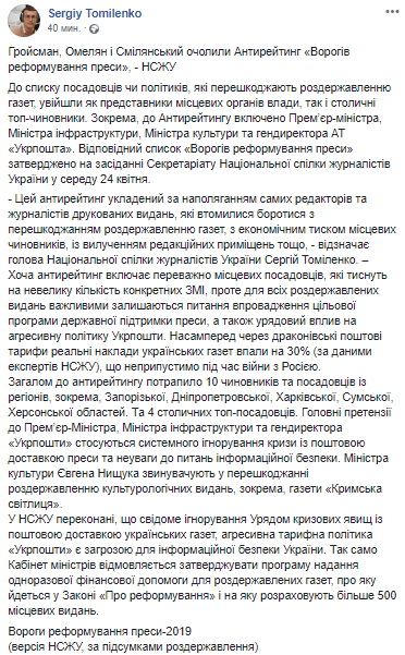 "В список должностных лиц или политиков, которые препятствуют разгосударствлению газет, вошли как представители местных органов власти, так и столичные топ-чиновники. В частности, в антирейтинг включен премьер-министр, министр инфраструктуры, министр культуры и гендиректор АО "Укрпочта". Соответствующий список "врагов реформирования прессы" утвержден на заседании Секретариата Национального союза журналистов Украины в среду 24 апреля", - пишет глава НСЖУ.