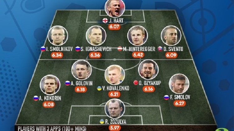 голкипер - Харт (Англия); защитники - Смольников, Игнашевич (оба - Россия), Хинтереггер (Австрия), Швенто (Словакия), полузащитники - Коваленко (Украина), Головин (Россия), Озякуп (Турция) - Смолов, Кокорин (оба - Россия), Зозуля (Украина).