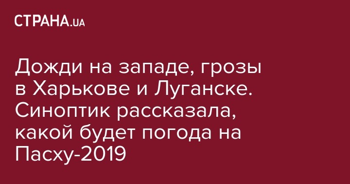 На Пасху, 28 апреля, в западных областях Украины, Харькове и Луганске возможны дожди. Об этом на своей странице в Facebook написала синоптик Наталья Диденко.