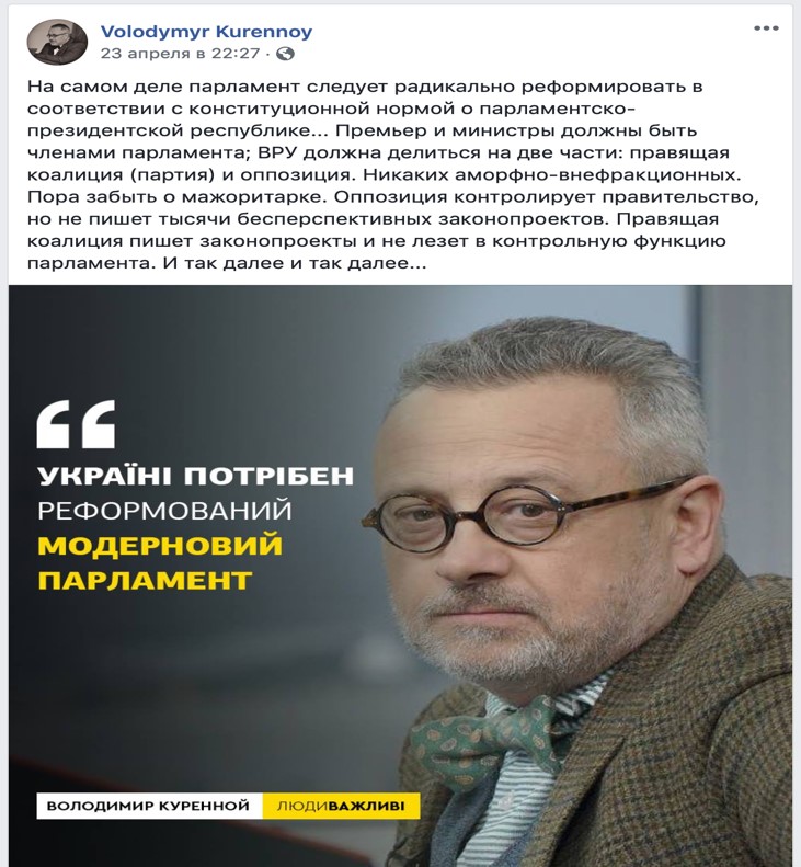 Накануне голосования он написал пост о том, что нужно оспорить право России на русский язык и чтобы с населением Донбасса говорила на русским языке не только Москва. Однако после этого проголосовал за закон об украинизации.