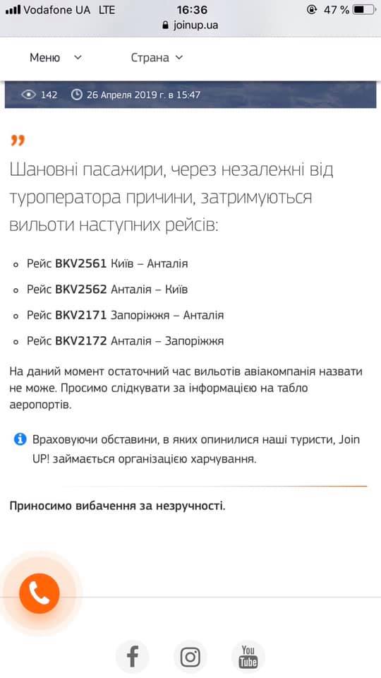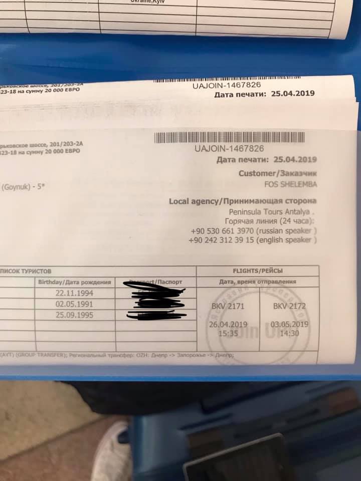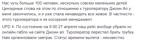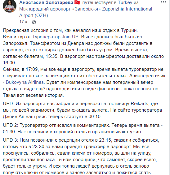 При туроператором выступил скандально известный Join UP!, а Bukovyna Airlines - авиаперевозчики. Туристы должны были вылететь из аэропорта Запорожья в 16:00 26 апреля, однако по состоянию на 9:00 27 апреля туристы остаются в Украине.