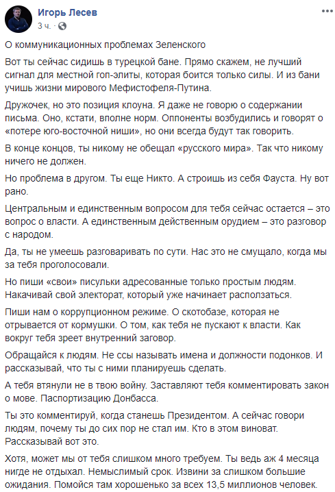 Раскритиковали Зеленского и в антимайдановском лагере (и здесь тоже уместны аналогии с Януковичем, который в итоге растерял и про- и антироссийскую аудиторию). Обозреватель Игорь Лесев заявил, что Зеленский "учит жизни Путина из турецкой бани".