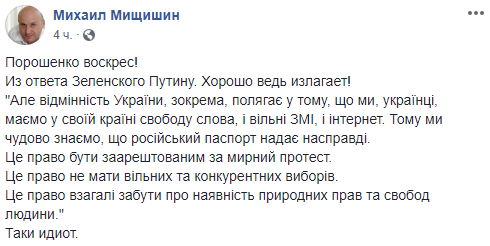 "Глупость, к сожалению, станет государственной политикой. В ответ на намерение Путина выдавать российские паспорта украинцам в Украине, Зеленский намерен выдавать украинские паспорта россиянам ... тоже в Украине. Эй, новоизбранные, вы там Путину "ответку" или подарки готовите? Представляете себе количество российских "диссидентов" в звании от прапорщика до полковника ФСБ, ГРУ и других полезных аббревиатур станут в очередь за украинским паспортом? Не представляете? Я так и думал. После этого заявления в Кремле под хохот шампанское открывали, а не заседание Совета Безопасности. Готов он к переговорам,