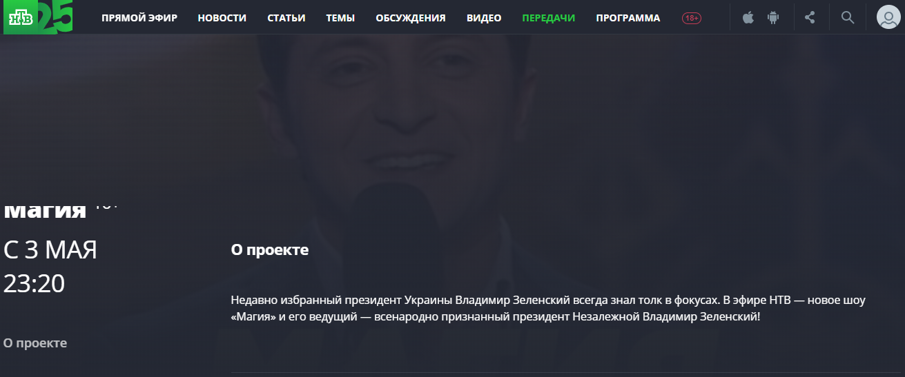 На российском телеканале "НТВ" с 3 мая выйдет в эфир шоу "Магия", снятое еще в 2011 году и ведущим которого был шоумен Владимир Зеленский, победитель второго тура президентских выборов 2019 года. Анонс шоу опубликован на сайте "НТВ".