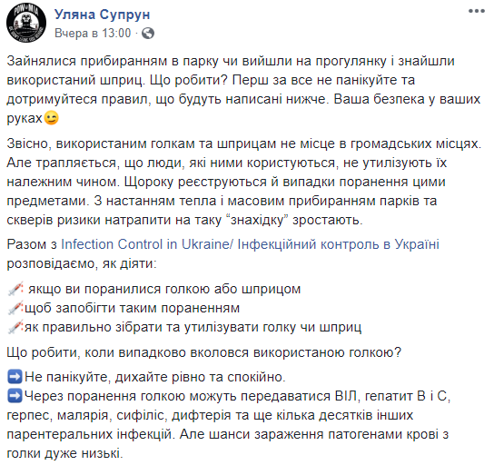 Глава Минздрава Ульяна Супрун рассказала, что украинцы могут наткнуться на использованные шприцы или иглы во время уборки или отдыха в парках и скверах. Как обезопасить себя от риска заразиться инфекцией и.о. министра здравоохранения написала на своей странице в Facebook