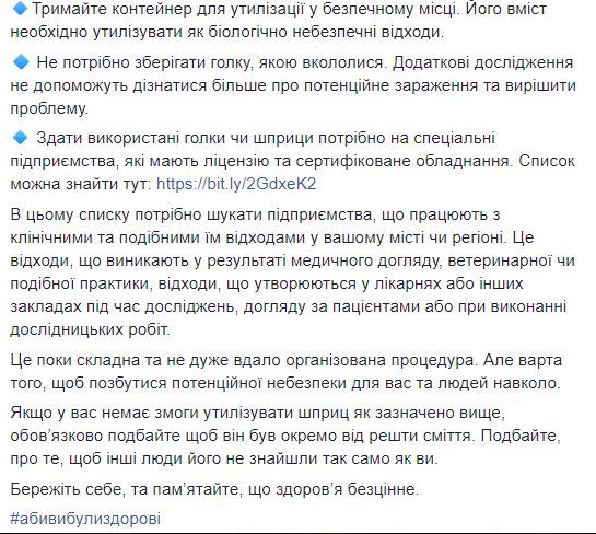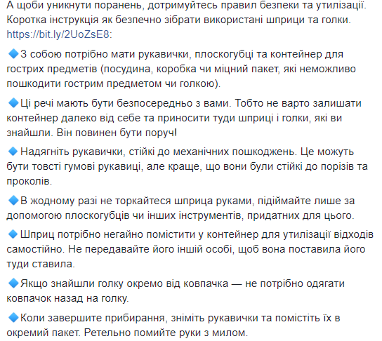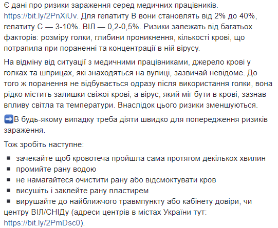 "Через ранение иглой могут передаваться ВИЧ, гепатит В и С, герпес, малярия, сифилис, дифтерия и еще несколько десятков других парентеральных инфекций. Но шансы заражения патогенами крови с иглы очень низкие. ...В отличие от ситуации с медицинскими работниками, источник крови в иглах и шприцах, которые находятся на улице, обычно неизвестен. К тому же, ранения не происходит сразу после использования иглы, она редко содержит остатки свежей крови, а вирус, который мог быть в крови, подвергся воздействию света и температуры. Вследствие этого риски уменьшаются", - говорится в сообщении.