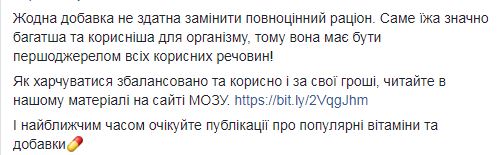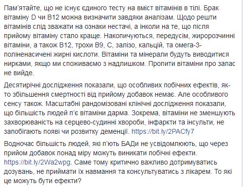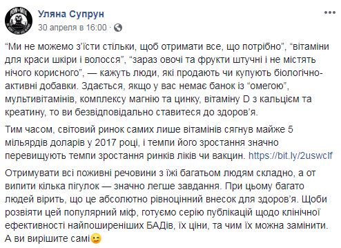 Результат от применения витаминных и биологически-активных добавок может быть не таким, как обещают производители, также могут быть побочные эффекты. Об этом в Facebook сообщила и.о. министра здравоохранения Ульяна Супрун.