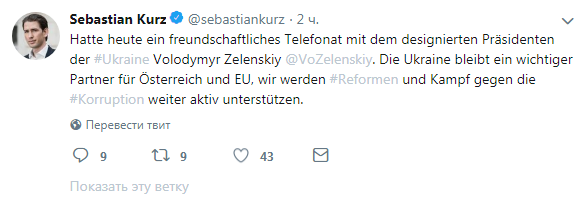 "Сегодня был дружеский телефонный разговор с новоизбранным президентом Украины Владимиром Зеленским. Украина остается важным партнером для Австрии и ЕС, мы будем продолжать активно поддерживать реформы и борьбу с коррупцией", - написал канцлер Австрии.