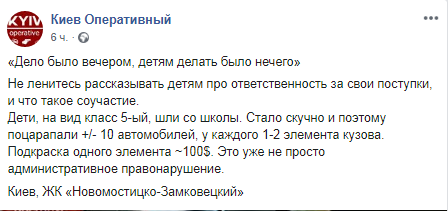 В Киеве компания из трех пятиклассников поцарапала около 10 автомобилей, припаркованных рядом с ЖК "Новомостицко-Замковецкий" на улице Сергея Данченко. Об этом сообщает "Киев Оперативный".