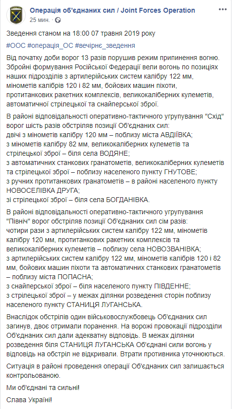 Во вторник, 7 мая, на Донбассе противник нарушил режим прекращения огня 13 раз, обстреляв позиции украинских военных, используя также крупнокалиберную артиллерию. Во время обстрелов был убит один украинский военный, еще двое получили ранения. Об этом сообщает пресс-центр штаба ООС в Facebook.