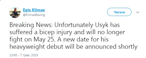 "К сожалению, Усик получил травму бицепса и не будет драться 25 мая. Скоро будет объявлена новая дата его дебюта в супертяжелом весе", - написал Эгис Климас.