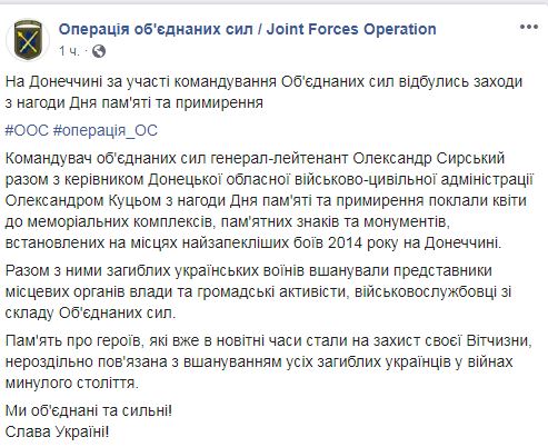 "Командующий объединенных сил генерал-лейтенант Александр Сырський вместе с руководителем Донецкой областной военно-гражданской администрации Александром Куцем по случаю Дня памяти и примирения возложили цветы на мемориальных комплексов, памятных знаков и монументов, установленных на местах самых ожесточенных боев 2014 года в Донецкой области", - говорится в сообщении.
