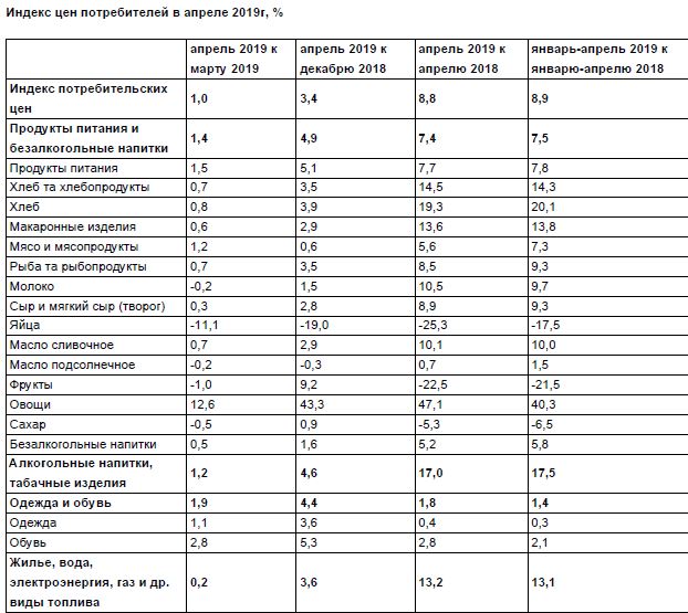 Так, в апреле инфляция составила 1% по сравнению с 0,9% в марте, 0,5% – в феврале и 1% в январе. В годовом измерении рост потребительских цен по итогам апреля ускорился до 8,8% с 8,6% по итогам марта, вернувшись на уровень февраля. Базовая инфляция в апреле 2019 года, наоборот, снизилась до 0,4% после скачка на 1,2% в марте, а в годовом измерении – до 7,4% с 7,6% по итогам марта, 7,8% – по итогам февраля и 8,3% – по итогам января.
