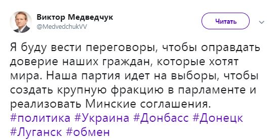 "Я буду вести переговоры, чтобы оправдать доверие наших граждан, которые хотят мира", - заявил Медведчук.