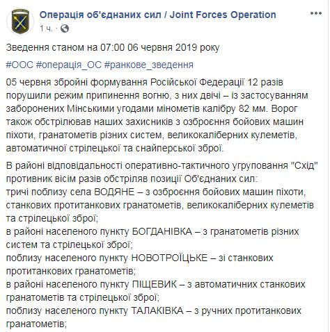 Всего за сутки противник 12 раз нарушал режим прекращения огня, из них дважды - с применением запрещенных минскими соглашениями минометов калибра 82 мм. "Враг также обстреливал наших защитников из вооружения боевых машин пехоты, гранатометов различных систем, крупнокалиберных пулеметов, автоматического стрелкового и снайперского оружия", - добавили в пресс-центре.