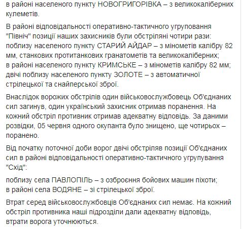 На Донбассе за прошедшие сутки, 5 июня, вследствие обстрелов со стороны противника погиб один военнослужащий из состава операции Объединенных сил, еще один получил ранения. Об этом сообщает пресс-центр ООС в Facebook.