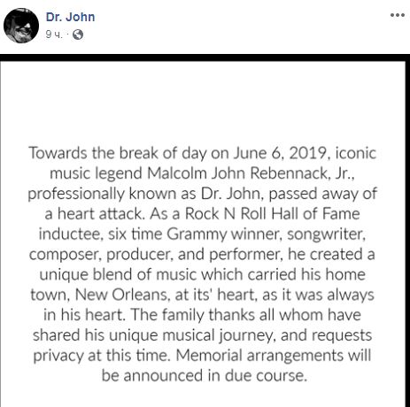 "6 июня 2019 года легендарный музыкант Малколм Джон Ребеннэк-младший, известный под профессиональным псевдонимом Доктор Джон, умер от сердечного приступа. Член Зала славы рок-н-ролла, шестикратный обладатель музыкальной премии Grammy, автор песен, композитор, продюсер и исполнитель создал уникальный музыкальный стиль, проникнутый духом его родного города Новый Орлеан",- говорится сообщении.