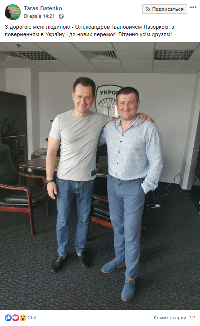 Экс-глава Укртранснафты Александр Лазорко вернулся в Украину. Об этом на своей странице в соцсети сообщил глава партии "Укроп" Тарас Батенко.