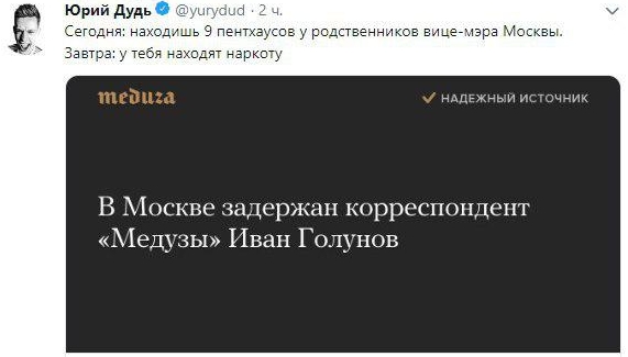 Журналист Юрий Дудь вспомнил об одном из расследований Голунова. "Сегодня: находишь 9 пентхаусов у родственников вице-мэра Москвы. Завтра: у тебя находят наркоту", - написал он в твиттере.