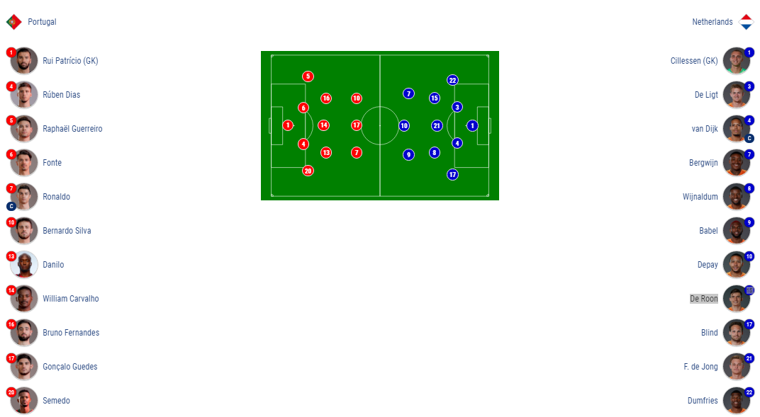 Португалия: Патрисиу - защитники Семеду, Диаш, Фонте, Геррейру - полузащитники Перейра, Карвальо, Б. Фернандеш - нападающие - Б. Силва, Роналду, Гедеш