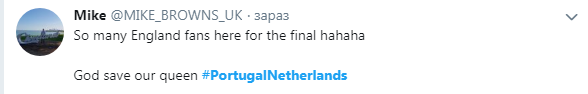 21:24 Mike‏ сообщает, что на финальный матч в Порту приехали многочисленные английские болельщики. Их команда в полуфинале проиграла Нидерландам 3:1, но сегодня реабилитировалась - выиграв бронзу у сборной Швейцарии по пенальти.
