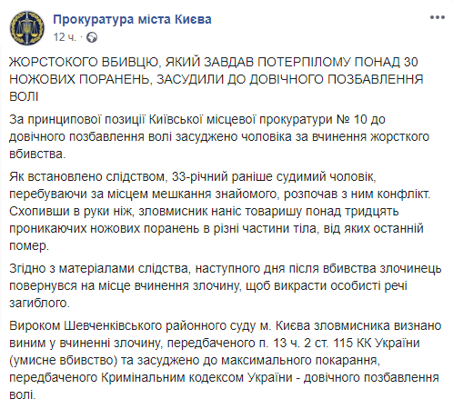 Жестокий убийца, который нанес мужчине более 30 ножевых ранений, был приговорен к пожизненному лишению свободы. Об этом сообщает пресс-служба прокуратуры Киева в Facebook.