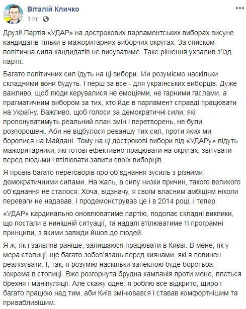 "Партия УДАР на досрочных парламентских выборах выдвинет своих кандидатов только в мажоритарных избирательных округах. По списку политическая сила не будет выдвигать кандидатов. Такое решение принял съезд партии", - говорится на странице Кличко.