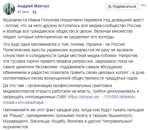 Блогер и журналист Андрей Манчук написал, что такая ситуация поддержки медиа-сообщества пока невозможна в Украине, поскольку политические аресты украинских журналистов ни разу не вызвали сочувствия и солидарности среди местной медиа-публики. Напротив, эта тусовка горячо приветствовала репрессии и помогала травить своих цеховых коллег.