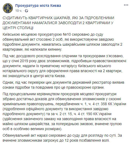 "Во время досудебного расследования следователями и прокурорами установлено, что в январе 2019 года двое злоумышленников, подделав правоустанавливающие документы, предоставили их частному нотариусу Киевского городского нотариального округа для оформления права собственности на 2 квартиры, которые находятся в центре города Киева", - говорится в сообщении.