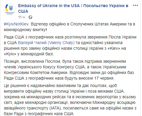 "Совет США по географическим названиям рассмотрел обращение Посла Украины в США Валерия Чалого и единогласно принял решение о замене официального названия столицы Украины с "Kiev" на "Kyiv" в международной базе", - говорится в сообщении.