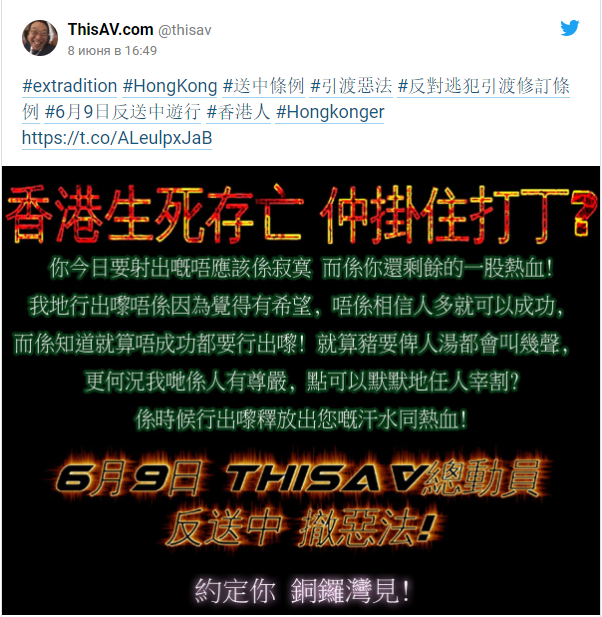 Вторым порносайтом стал ThisAV, который повесил уведомление о протестах еще 8 июня, перед первыми демонстрациями. Администраторы призвали пользователей защитить свои права и обратились к ним напрямую: "Гонконг умирает. А ты всё ещё дрочишь?"