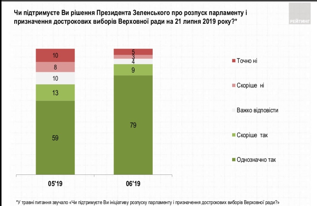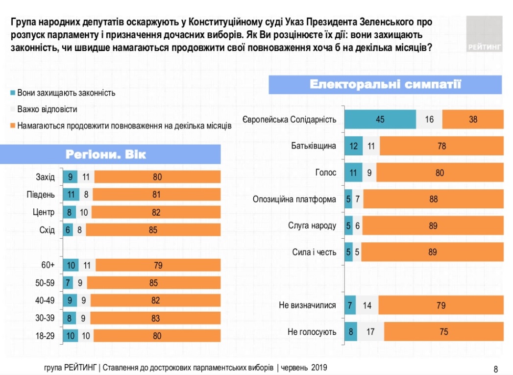 "Поддержка досрочных выборов, вера в эффективность будущего парламента и тезис о попытке народных депутатов продлить свои полномочия через обжалование решения о роспуске Верховной Рады имеют абсолютную поддержку во всех возрастных, региональных и электоральных группах, за исключением сторонников партии "Европейская солидарность", которые в своем большинстве против досрочных выборов и считают, что будущий парламент будет менее эффективным, а обжалование депутатами решения президента В.Зеленского о роспуске Верховной Рады в Конституционном суде является защитой законности", - говорится в релизе "Рейтинга".